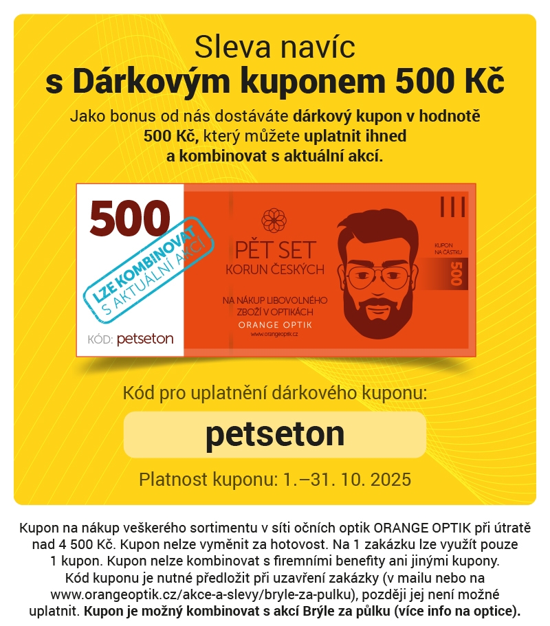 - Sleva 50 % na všechny obruby vybraných značek ve všech prodejnách - Gepard, Laresia Mageh, Infinity, Josef Klír, Dr. Eyes a Ocoolar. Sleva je 45 %, plus dalších 5 % pro členy Oranžového klubu (platí i pro nové zákazníky) = celkem 50 %.