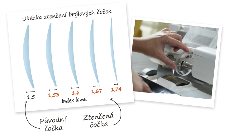 Estetika: tenčí okraje čoček působí elegantněji, zejména u vyšších dioptrií, kde běžné čočky bývají silné a nápadné.