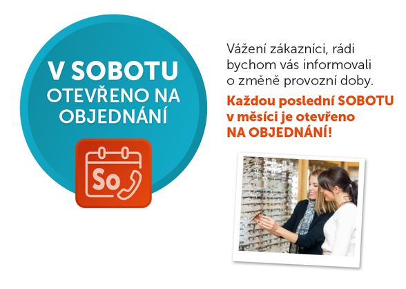 Objednat se můžete e-mailem, telefonicky, osobně nebo v online formuláři Měření zraku. Sobotní otevírací doba: 8–12 hodin.